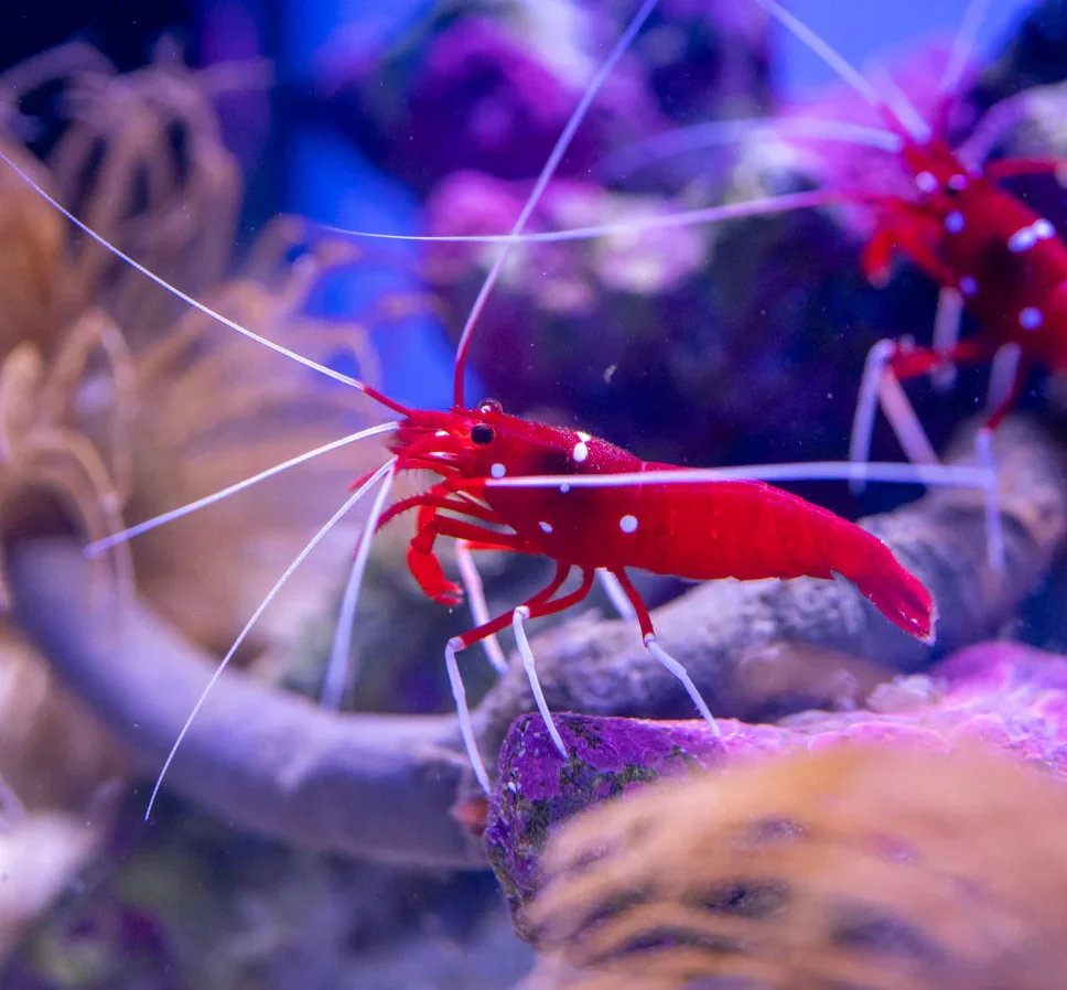 The Blood Red Fire Shrimp (Lysmata debelius), also known as Blood Shrimp, Fire Shrimp, or Scarlet Cleaner Shrimp, is one of the most popular ornamental shrimp in the marine aquarium hobby. The Blood Red Fire Shrimp boasts striking blood-red coloration with brilliant white spots and long white antennae. Depending on which region of the Indo-Pacific from which it originates, the Blood Red Fire Shrimp may have the white dots just on its carapace or covering its entire body.
